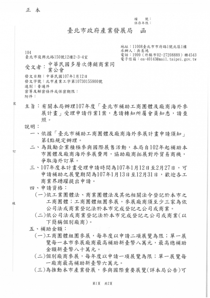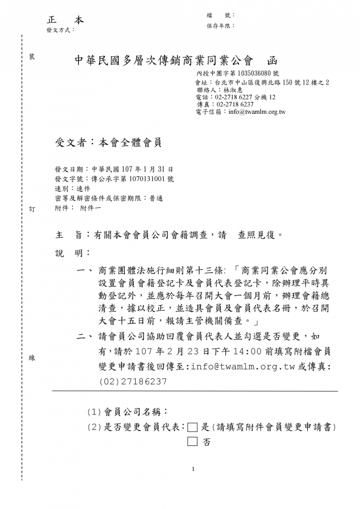「國立臺北商業大學108 年度多層次傳銷管理產業碩士專班(秋季班)」產學合作開課計畫案,預計招生名額10 至15 人,請本會會員公司踴躍提出申請,並請將「產學合作共同申請意向書及履約保證金」於107 年10 月15 日前送繳本會彙整統計