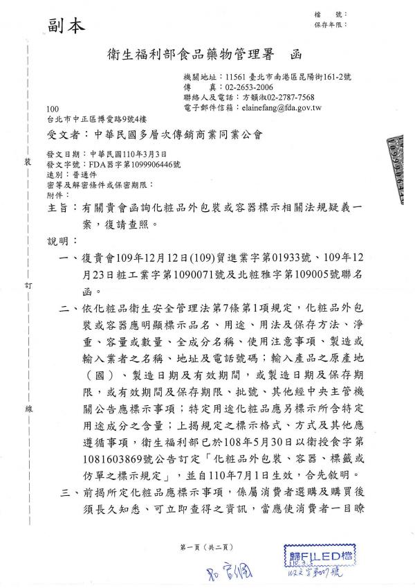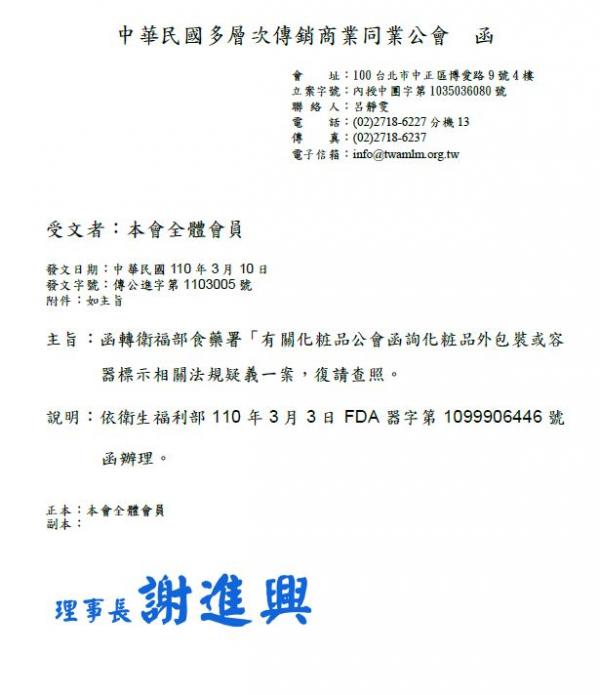 主旨:函轉衛福部食藥署「有關化粧品公會函詢化粧品外包裝或容器標示相關法規疑義一案,復請查照。