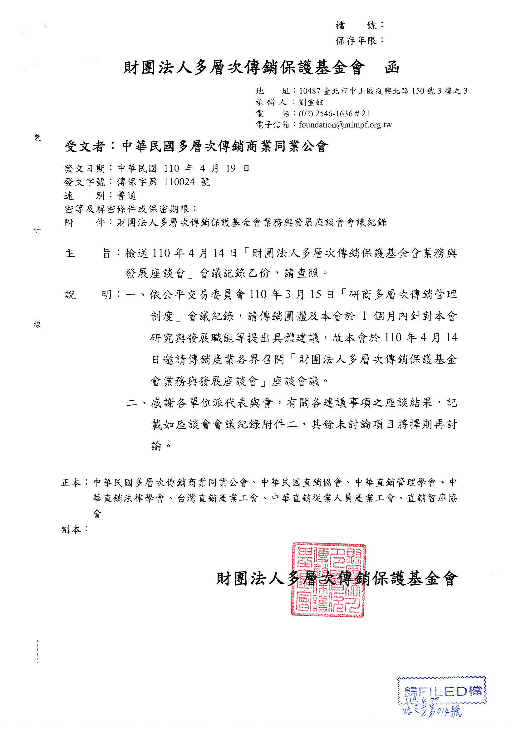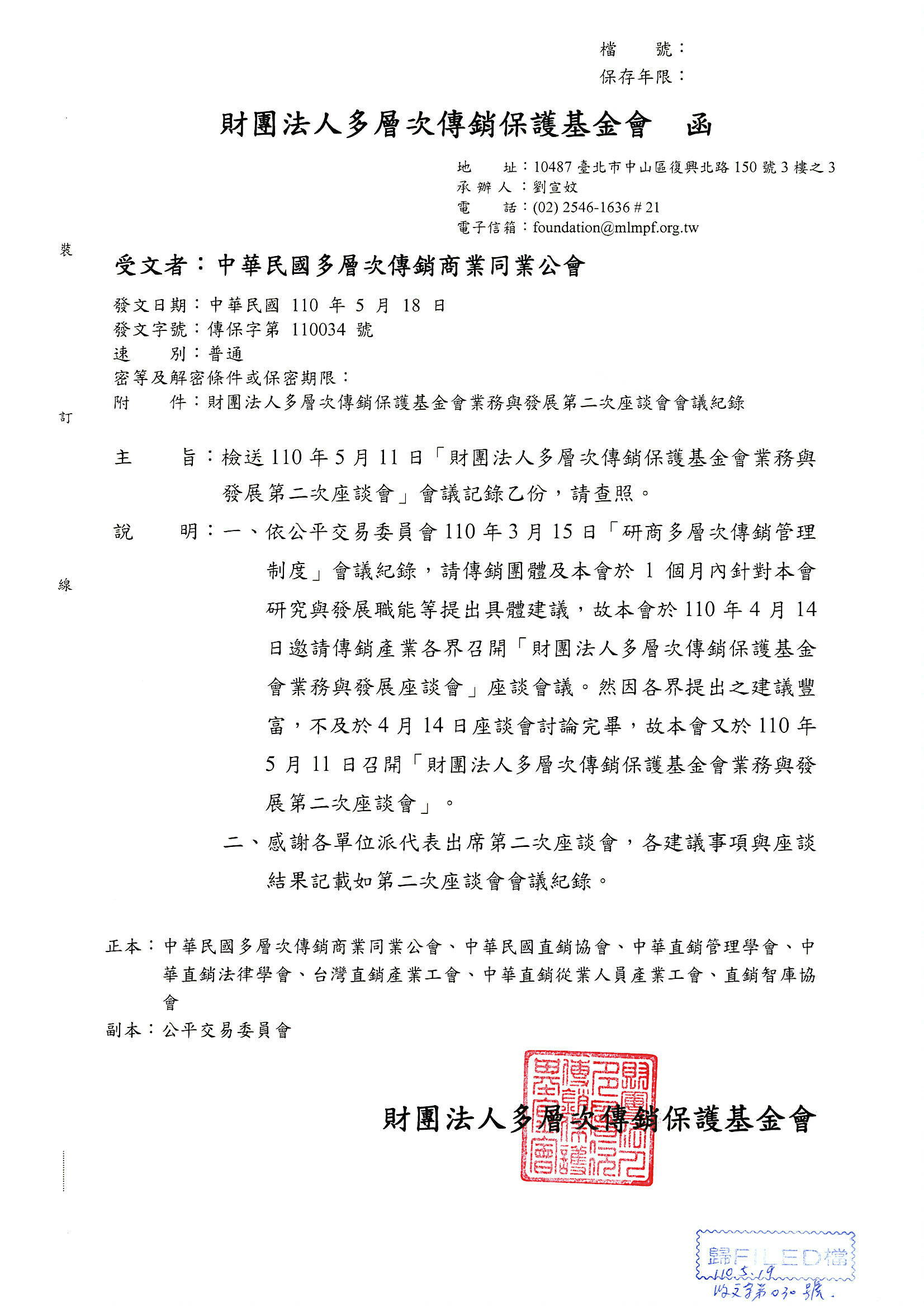 說明:依據財團法人多層次傳銷保護基金會110年5月18日傳保字第110034號函辦理。