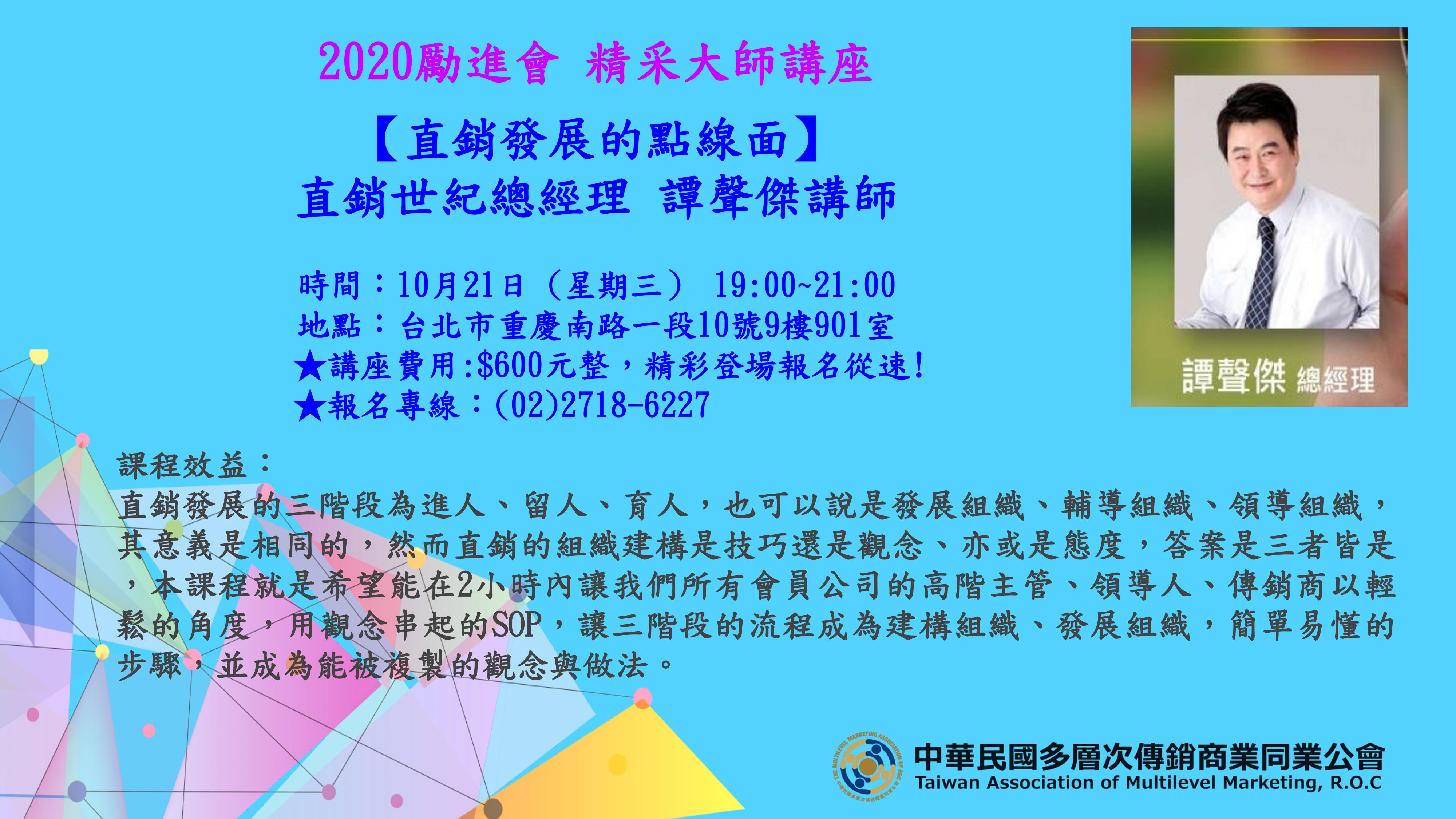 ※精彩講座--10/26(三) 勵進會【2020大師系列講座】譚聲傑主講:直銷發展的點線面