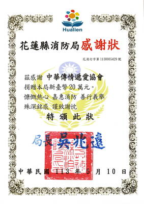 113.04.03花蓮7.2級強震 捐助花蓮消防局救難前進指揮所 20萬元